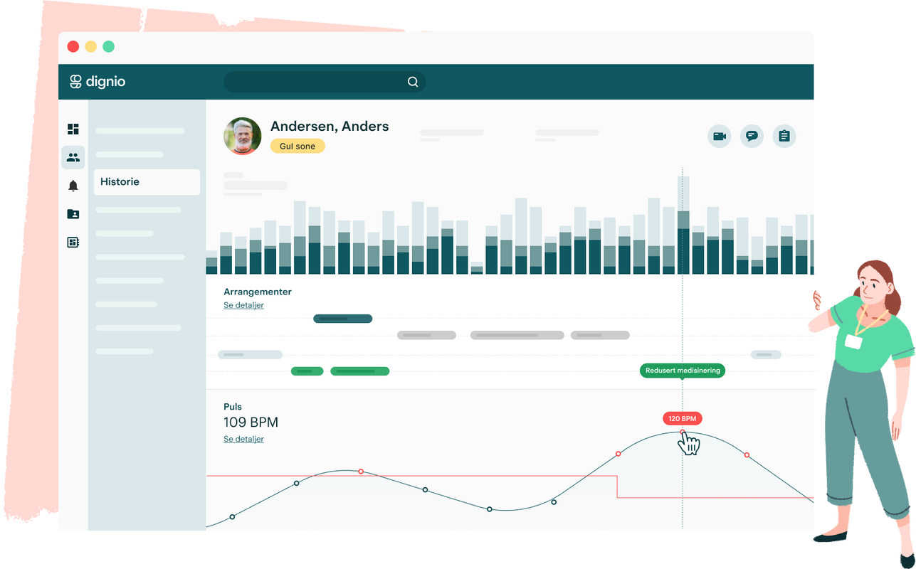Se trender og få viktig beslutningsstøtte gjennom historiske data fra målinger, spørreskjema og kommunikasjon. Med Dignio Connected Care er alt samlet på ett sted slik at helsepersonell kan bruke tiden på det som er viktigst: å yte best mulig helsehjelp til pasientene.