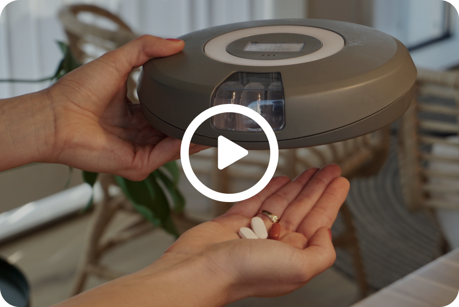Mobili larmar med ljud och ljus vid den valda medicineringstiden. Användaren trycker enkelt på ljusringen för att få ut medicinerna.